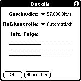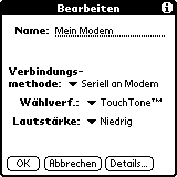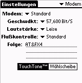 zwingend erforderlich. Was ist zu beachten? - Zunächst ein Modem auswählen bzw. in neueren Systemen eine neue Verbindung anlegen und eindeutig benennen - In neueren Palms und OS-Versionen ist einzustellen, ob die Verbindung über ein serielles Kabel bzw. Snap-On oder Infrarot erfolgt - In Deutschland sollte das Wählverfahren auf Touch Tone belassen werden, es sei denn, man wählt über eine Nebenstellenanlage ein, die lediglich Pulse-Dial (im Palm Wählscheibe) unterstützt. Im Ausland Erkundigungen einziehen und im Zweifelsfall Wählscheibe wählen. Mobilfunk-Verbindungen immer über Touch Tone - Die Einstellung der Lautstärke betrifft den Modemlautsprecher, falls vorhanden. Beim Auftreten von Verbindungsproblemen kann es sinnvoll sein, hier auf hoch zu stellen, um Wählen und Connect mitzuverfolgen. - Unter Geschwdkt wählen Sie zunächst den höchstmöglichen Wert. Wenn damit keine Verbindungen zustandekommen, können Sie den Wert schrittweise niedriger setzen bzw. bei Mobilfunkverbindungen gleich 9.600 Bit/s einstellen. - Die Flußkontrolle sollten Sie auf Automatisch