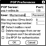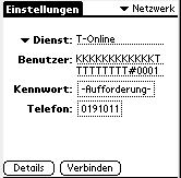 Beispiel: Eintrag im PalmPilot unter "Benutzer": 0000123456780407654321#0001 Kennwort: Hier wird das T-Online-Paßwort eingegeben. Zum Schutz der Zugangsdaten ist es empfehlenswert, hier keine Angabe zu machen*. Das Kennwort wird dann beim Einloggen abgefragt. Telefon: Die bundeseinheitliche Einwahlnummer ist 0191011 Wer per Handy