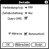 DNS" heißen) Query DNS (heißt es im Palm III, IIIx und V): - hier in das Kästchen klicken, um die Option zu aktivieren und die Adressen zuweisen zu lassen. Wer unbedingt möchte, trägt die Adresse des Primären Domain Name Servers ein: 194.25.2.129 - diese IP-Nr. kann sich jedoch ändern, deshalb rate ich, beide DNS-Felder leer zu lassen bzw. (Palm III, IIIx und V) Query DNS zu aktivieren. IP-Adresse: Durch Aktivierung der Checkbox vor "Automatisch" läßt man sich die IP-Adresse beim Login dynamisch zuweisen. Script: Wir schauen durch Klick auf diesen Button nach, ob sich im Fenster Anmeldescript der Eintrag ENDE: befindet, mehr darf dort nicht stehen! Weitere Angaben sind nicht erforderlich, mit "OK" wird gespeichert.